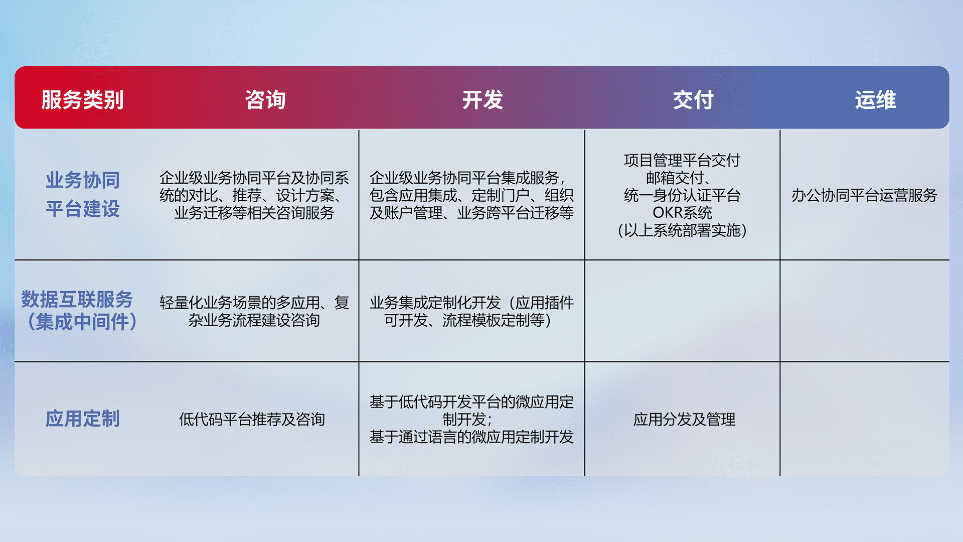 针对钉钉、、企微、、IDaas等平台级产品提供产品的规划、、、、方案、、、交付、、定制化开发等服务,,,实现如统一协同办公、、、、智能客户服务、、混合会议管理、、、、智能数据查询、、、等业务场景,,,实现数字化转型。。。。